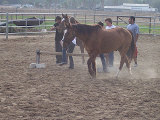And there's Mr. V. just out in the middle of the madness. That man has no fear. I, on the other hand, have a healthy fear of a 1200+ lb animal and stayed the hell away from them. Let them sort out the pecking order, then I'll get involved. If I'm going to get kicked ~ let it be by ONE horse at at time (not 4 of them). Although, I DID jump into the stall with the mustangs, once we rounded them up... They are sweet, amazing horses...